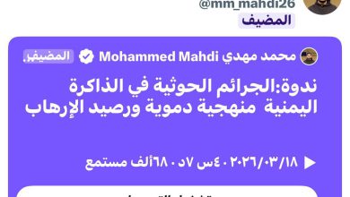 20 مارس، 20260ندوة موسعة وهامة بعنوان ”الجرائم الحوثية في الذاكرة الوطنية اليمنية” نظمها مركز البحر الأحمر للدراسات والشبكة اليمنية للحقوق والحريات