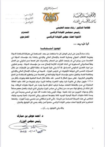 سلم رئيس الحكومة اليمنية، الدكتور أحمد عوض بن مبارك، يوم السبت، 3 مايو 2025، استقالته من منصبه، الى رئيس مجلس القيادة الرئاسي رشاد العليمي.