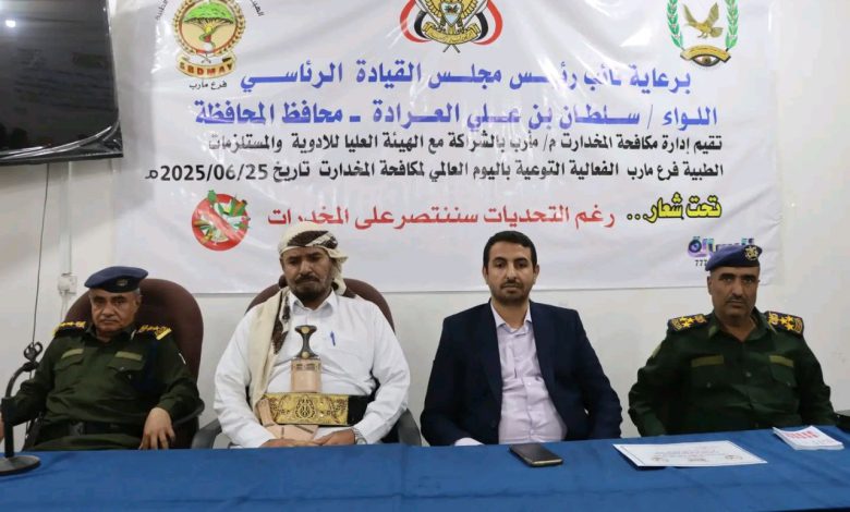 أقامت إدارة مكافحة المخدرات بشرطة محافظة مأرب (شمال شرقي اليمن) يوم الأربعاء 25 يونيو 2025م، فعالية توعوية بمناسبة اليوم العالمي لمكافحة المخدرات، بالتعاون مع فرع الهيئة العليا للأدوية والمستلزمات الطبية.