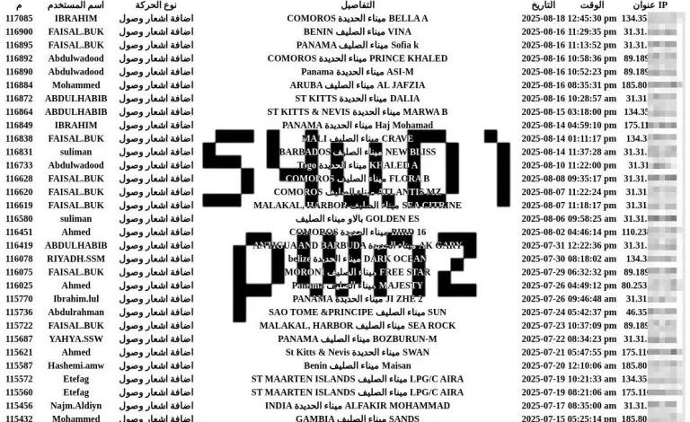 نشر قراصنة يطلقون على أنفسهم S4uD1Pwnz (سفوردي بونز) اليوم الثلاثاء 19 أغسطس/آب، بيانات شاملة لأكثر من 33 ألف رحلة الصادرة والواردة من وإلى موانئ الحديدة بعد تمكنها من اختراق والتعطيل الكلي لنظام مؤسسة موانئ البحر الأحمر الخاضعة لجماعة الحوثي المصنفة إرهابية.