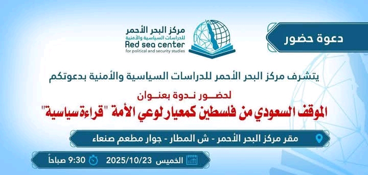 ينظم مركز البحر الأحمر للدراسات السياسية والأمنية يوم غدا الخميس الموافق 23 أكتوبر 2025 الساعة 9:30 صباحًا، ندوة سياسية تحت عنوان: “الموقف السعودي من فلسطين كمعيار لوعي الأمة- قراءة سياسية”، وذلك في مقر المركز بمدينة مأرب، شرق اليمن.