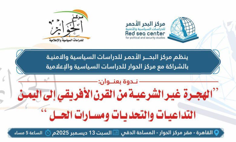 ينظم مركز البحر الأحمر للدراسات السياسية والأمنية بالشراكة مع مركز الحوار للدراسات السياسية والإعلامية ندوة تعقد غدًا السبت الموافق 13 ديسمبر 2025 في تمام الساعة الخامسة مساءً وذلك بمقر مركز الحوار للدراسات في العاصمة المصرية القاهرة.