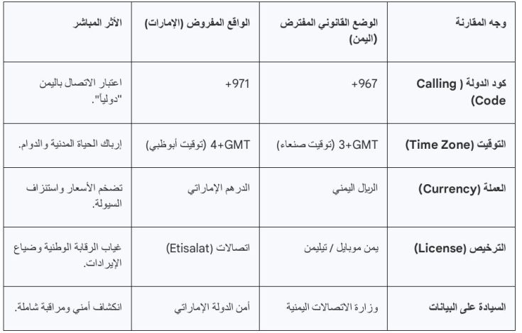تنص اللوائح على أن تشغيل مزود خدمة داخل نطاق دولة أخرى يتطلب موافقة رسمية. استخدام الكود (MCC 424) الخاص بالإمارات داخل الأراضي اليمنية (MCC 421) يمثل إشكالًا يتعلق بالسيادة الرقمية.