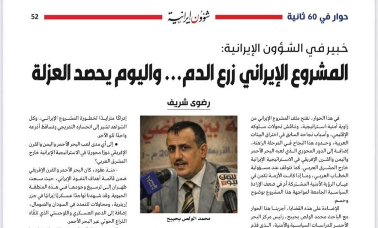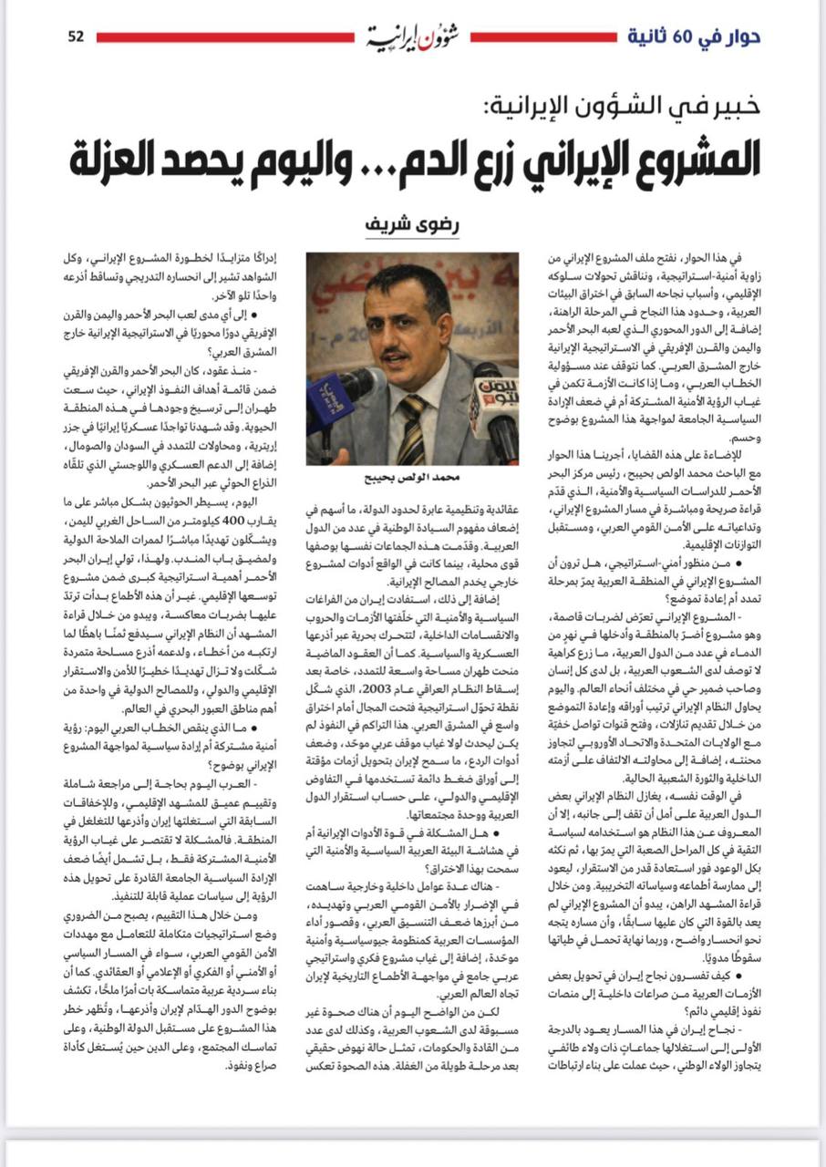 أجرت مجلة شؤون إيرانية المصرية حوارا صحفيا، مع الأستاذ محمد الولص بحيبح رئيس مركز البحر الأحمر للدراسات السياسية والأمنية.