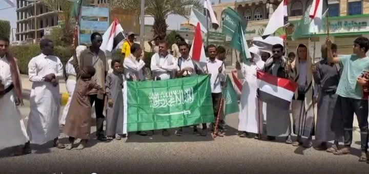 ورفع المشاركون أعلام المملكة العربية السعودية، مؤكدين أن أمن المملكة ودول الخليج يمثل جزءاً لا يتجزأ من أمن اليمن والمنطقة.